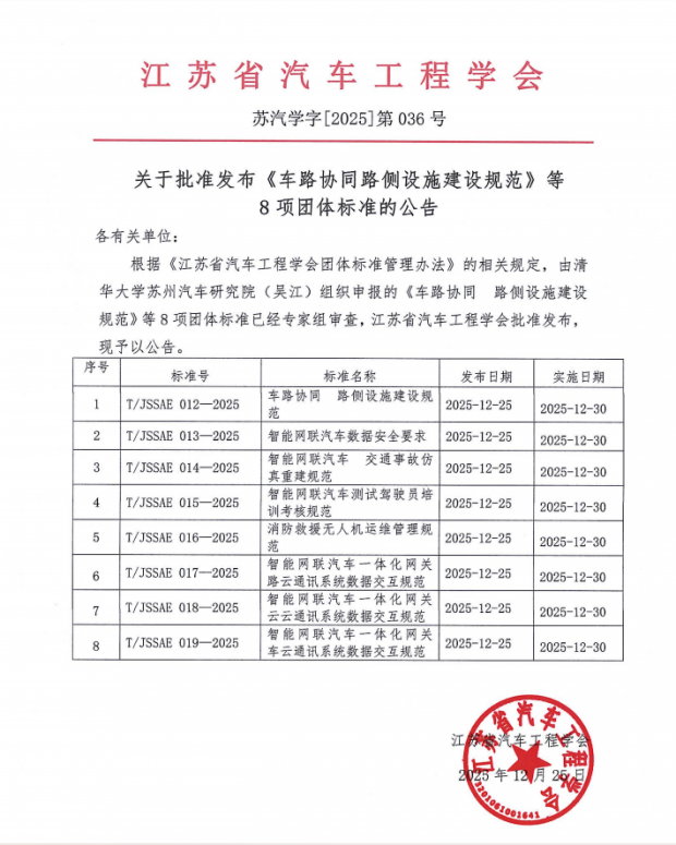 由江苏省汽车工程学会批准,清研车联教育科技有限公司深度参与起草的《智能网联汽车一体化网关 云云通讯系统数据交互规范》(T/JSSAE 018-2025)等8项团体标准,于2025年12月25日正式发布,2025年12月30日起实施!这标志着车路云一体化系统数据交互迈入标准化时代,为智能网联产业协同发展奠定坚实基础。